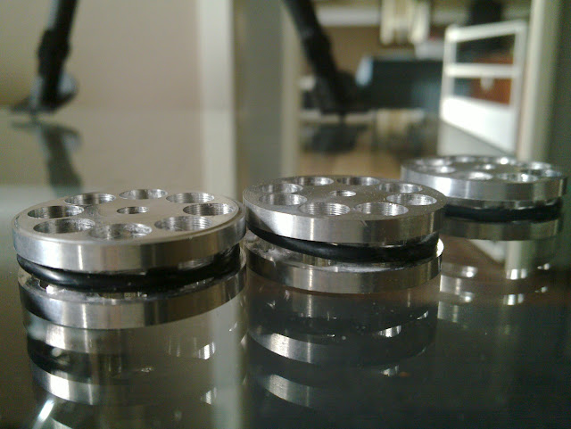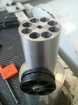 Heivasin myös vaimennin adapterin mäkeen ja pyöräytin metriset kierteet piipun nokkaan ja tekaisin niille passaavan vaimentimen 40mm rosteri putkesta ja vaimennin elementtiin kopsasin rakenteen tuosta SAK modell 1:sestä. Sisuskalut on siis koneistettu T6 alumiini tangosta ja istutettu paikalleen lämpö sovitteella.