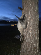 Eilen illasta päätin lähteä vielä suolle piston tekemässä ja sieltähän tokka jostakin ihmeestä löytyi rimmestä. Sopivasti metsäsaareke antoi suojaa ja konttasin koiran kans lähemmäs vaan eipä lintuja enää näkyny siinä missä piti. 250-300m päässä alkoikin liikettä näkyä mättäiden seassa eli sinne olivat kävelleet. No eipä siinä näkösuojan loppuessa auttanut kun seurata mihin tilanne johtaa ja nehän lähti käveleen taas lähemmäs. Tässä vaiheessa etsin mättään mistä voisi mahdollisesti kumauttaa jos tarjoaisivat hollia. Pitkän tovin kuluttua ne oli jossain vajaassa 200 metrissä ja kaulat vain näkyvillä. Vartija nousi sitten kylen tarjoten niin laskin siihen läpi. 3,5kg aikanen koiras  |