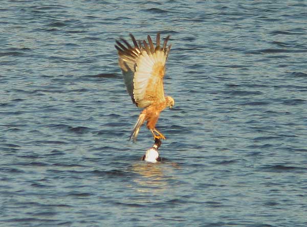 Kuvatekstinä kuvalle: Ruskosuohaukka yrittää nostaa Vanjärvestä kuolleen telkän, joka on tarttunut